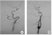1.1對象2011-08至2012-02在我院住院的缺血性腦卒中患者,經腦血管造影篩選出年滿18周歲、頸內動脈迂曲(頸內動脈彎曲如螺旋狀或有2個或2個以上的彎曲)、而無狹窄或閉塞的患者30例(迂曲組,圖1A),無頸內動脈迂曲、狹窄或閉塞的患者30例(無迂曲組,圖1B)。所有患者在腦血管造影前均簽署手術知情同意書。