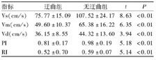 指標迂曲組無迂曲組tPVs(cm/s)75.77±15.09107.52±24.178.63<0.01Vm(cm/s)49.60±10.3765.38±16.226.35<0.01Vd(cm/s)36.15±8.5544.32±13.603.94<0.01PI0.81±0.170.98±0.195.18<0.01RI0.52±0.700.59±0.075.14<0.013討論