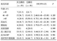 (n=30)OR(95%CI)P年齡(歲)<45 7(23.3)2(6.7)146~6517(56.7)13(43.3)2.68(0.48-15.09)0.265>65 6(20.0)15(50.0)8.75(1.40-54.80)0.020高血壓14(46.7)21(70.0)5.42(1.42-22.28)0.019糖尿病6(20.0)9(30.0)2.75(0.57-13.37)0.210高膽固醇0(0) 6(20.0)-0.999高三酰甘油13(43.3)12(40.0)0.66(0.15-2.96)0.589高HsCRP8(26.7)6(20.0)0.98(0.16-6.04)0.981高同型半胱氨酸13(43.3)14(46.7)0.70(0.26-1.91)0.487