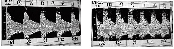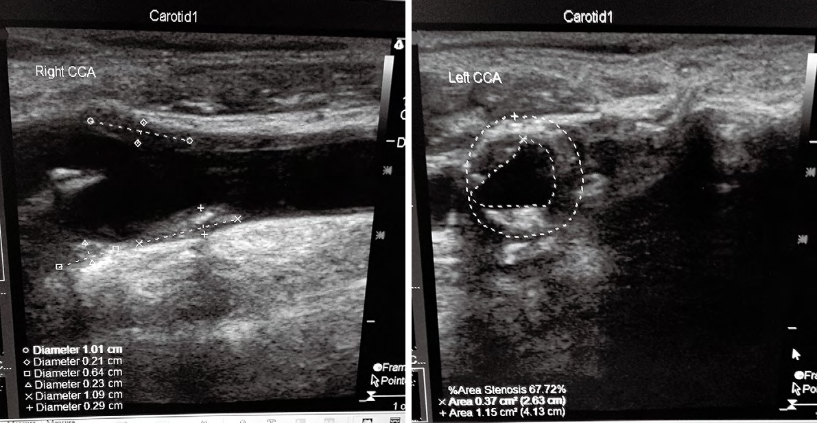 下圖1、2是114例患者中的典型病例,老年男性,主訴為頭昏伴雙手麻木不適數(shù)月,加重1周來我院神經(jīng)科門診就診,予TCD和頸動脈超聲聯(lián)合檢查進行早期篩查。檢查結(jié)果如下: