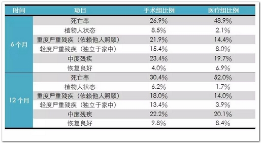 GOS-E在兩組之間分布有差別(P <0.001)。在6個(gè)月時(shí),GOS-E分布如下:手術(shù)組201例患者死亡率為26.9%,而醫(yī)療組188例患者為48.9%;植物人狀態(tài),8.5%對2.1%;重度嚴(yán)重殘疾(依賴他人照顧),21.9%對14.4%;輕度嚴(yán)重殘疾(獨(dú)立于家中),15.4%對8.0%;中度殘疾,23.4%對19.7%;恢復(fù)良好,4.0%對6.9%。在12個(gè)月時(shí),GOS-E分布如下:194名手術(shù)患者死亡率為30.4%,179名醫(yī)療患者為52.0%;植物人狀態(tài),6.2%對1.7%;重度嚴(yán)重殘疾,18.0%對14.0%;輕度嚴(yán)重殘疾,13.4%對3.9%;中度殘疾,22.2%對20.1%;恢復(fù)良好,9.8%對8.4%。